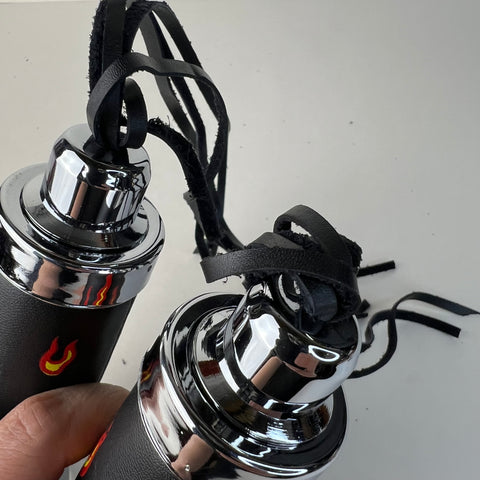 THIS IS A SET OF GRIPS THAT ARE JUST ASTONISHING. THEY ARE MADE VERY WELL. I HAVE SOLD THEM TO PEOPLE WHO HAVE EVEN USED THEM ON MOTOR BIKES, MINI BIKES CARTS AND SCOOTERS. THEY ARE PART CHROME WITH LEATHER AND WITH LEATHER STREAMERS. NICE LEATHER EASY GRIP FEEL GREAT, CUSTOM MADE GRIPS. THEY ARE 6 INCH LONG GIVE OR TAKE, FIT TO 99% OF MOST BIKES, FIT 7/8" BARS.