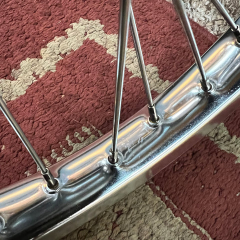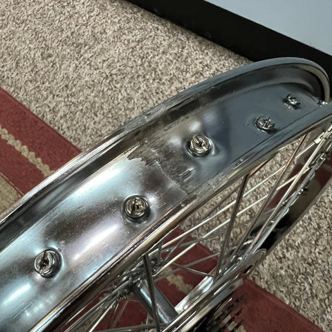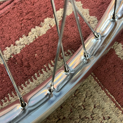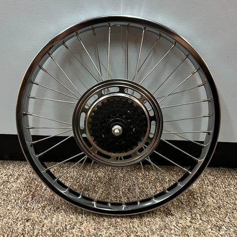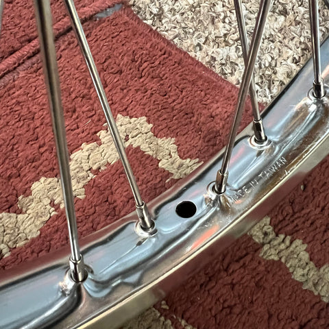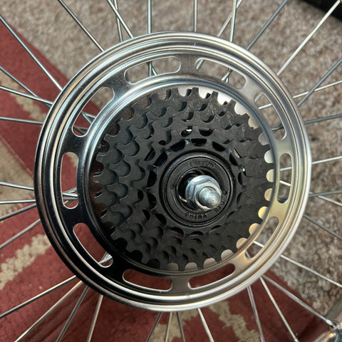 THIS IS A COMPLETE FIVE SPEED WHEEL TO FIT THE SCHWINN STINGRAY LINE AND OTHER BRANDS OF BICYCLES AS WELL. THIS WHEEL IS A 20 X 2.125 SIZE, NEVER USED CONDITION, NO RUST. IT'S JUST ASTONISHING, IT CAN TAKE THE SCHWINN SLICK TIRE TO FIT S-2 RIMS, IT CAN TAKE ANY 20 X 2.125 TIRES LIKE GRIPPER SLIK, SLICK TIRES & OTHERS. GREAT QUALITY OLD STYLE WITH GREAT CHROME, I WILL GRADE THE CHROME 10/10, THERE MIGHT BE SOME SHELF WEAR FROM MOVING AROUND / STORAGE BUT THEY LOOK FINE. COME COMPLETE WITH 5 SPEED COG GEAR, SPOKE PROTECTOR AND WHEEL NUTS, THE 5 SPEED FREE WHEEL STAMPED FALCON - CHINA ON IT, NOT A USA PRODUCT BUT WILL WORK FINE. IT READY TO BOLT ONTO THAT VINTAGE MUSCLE BIKE, SHOW BIKE OR YOUR RIDER BIKE. IT'S MADE VERY WELL, VERY STRONG WITH HEAVY DUTY SPOKES, 12G SPOKES. THE WHEEL AXLE IS 3/8", AND THE WHEEL HAVE 36 SPOKES. THE WIDTH OD IS 38MM. THIS WHEEL FITS THE ORANGE KRATE, GREY GHOST, APPLE KRATE, PEA PICKER, COTTON PICKER AND THE OTHER KRATES / STINGRAYS. WILL ALSO FIT THE HUFFY, SEARS, MURRAY, AMF AND ALL OTHER 20 INCH BIKES. THIS IS NOT AN ORIGINAL SCHWINN WHEEL THAT WAS MADE IN 60S, 70S IN USA, THIS IS A RIM THAT MADE TO FITS THE SCHWINN BIKES, IT STAMPED MADE IN TAIWAN ON IT BUT THE RIM IS ABSOLUTELY HEAVY DUTY AND BEAUTIFUL, I GOT THESE LONG TIME AGO SO THIS WHEEL IS NO LONGER SOLD IN STORES ANYMORE & I BELIEVE ONLY MYSELF STILL HAVE SOME OF THESE LEFT IN STOCK. WHY PAY $500.00 OR SO FOR A MINT SCHWINN WHEEL WHEN YOU CAN GET THIS GEM FOR TON LESS AND LOOKS CLOSE TO THE SAME? THIS WHEEL ALSO CAN TAKE ANY 20 X 1.75 TIRES TO 20 X 2.125. GET THE WHEEL WHILE IT STILL AVAILABLE.